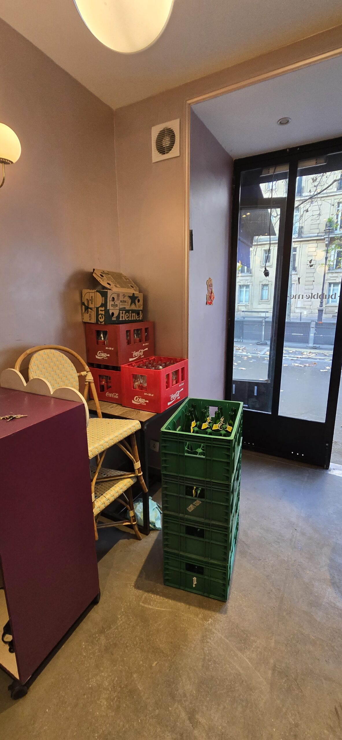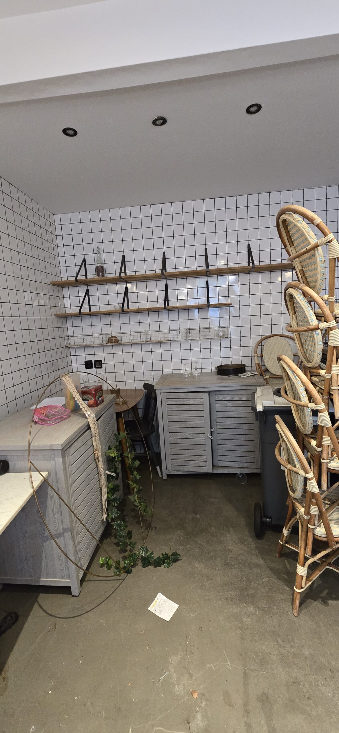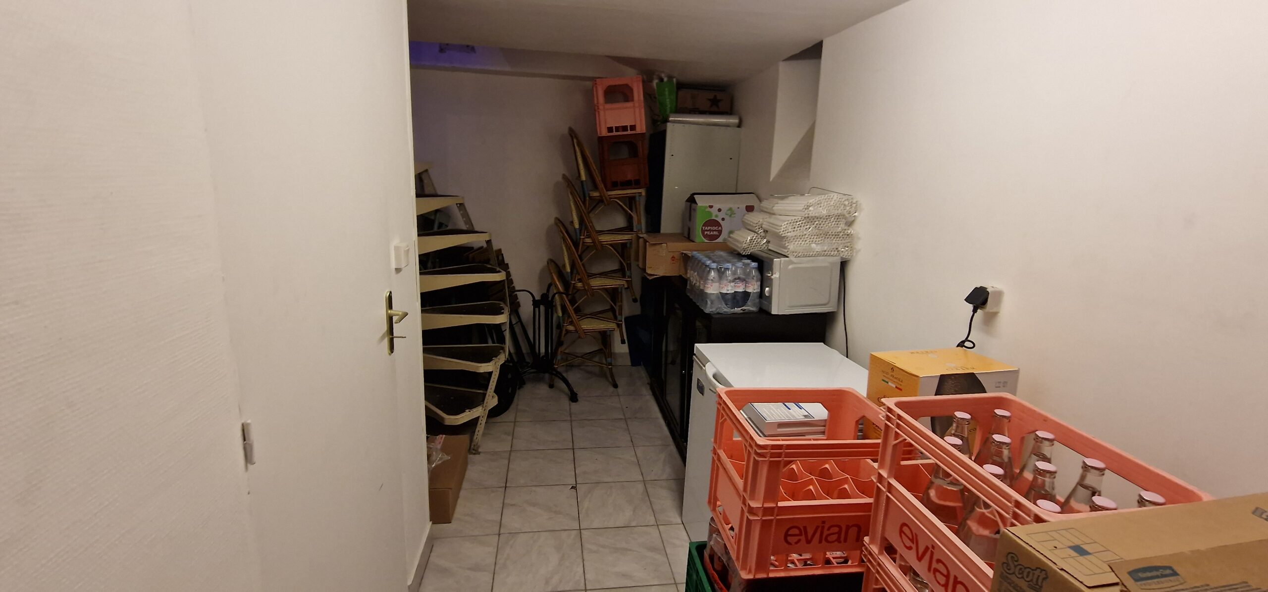 Une boutique avec sous-sol accessible par un escalier intérieur sous trappe.