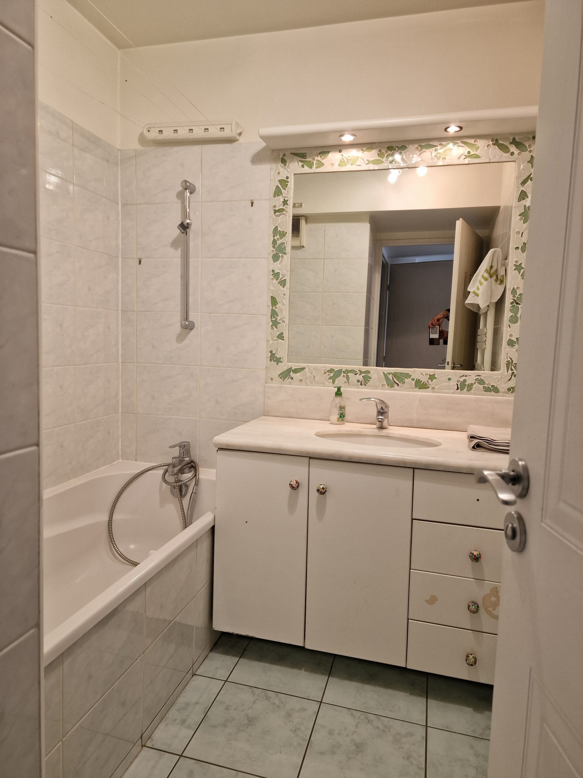Salle de bains avec baignoire lavabo et sèche serviette.